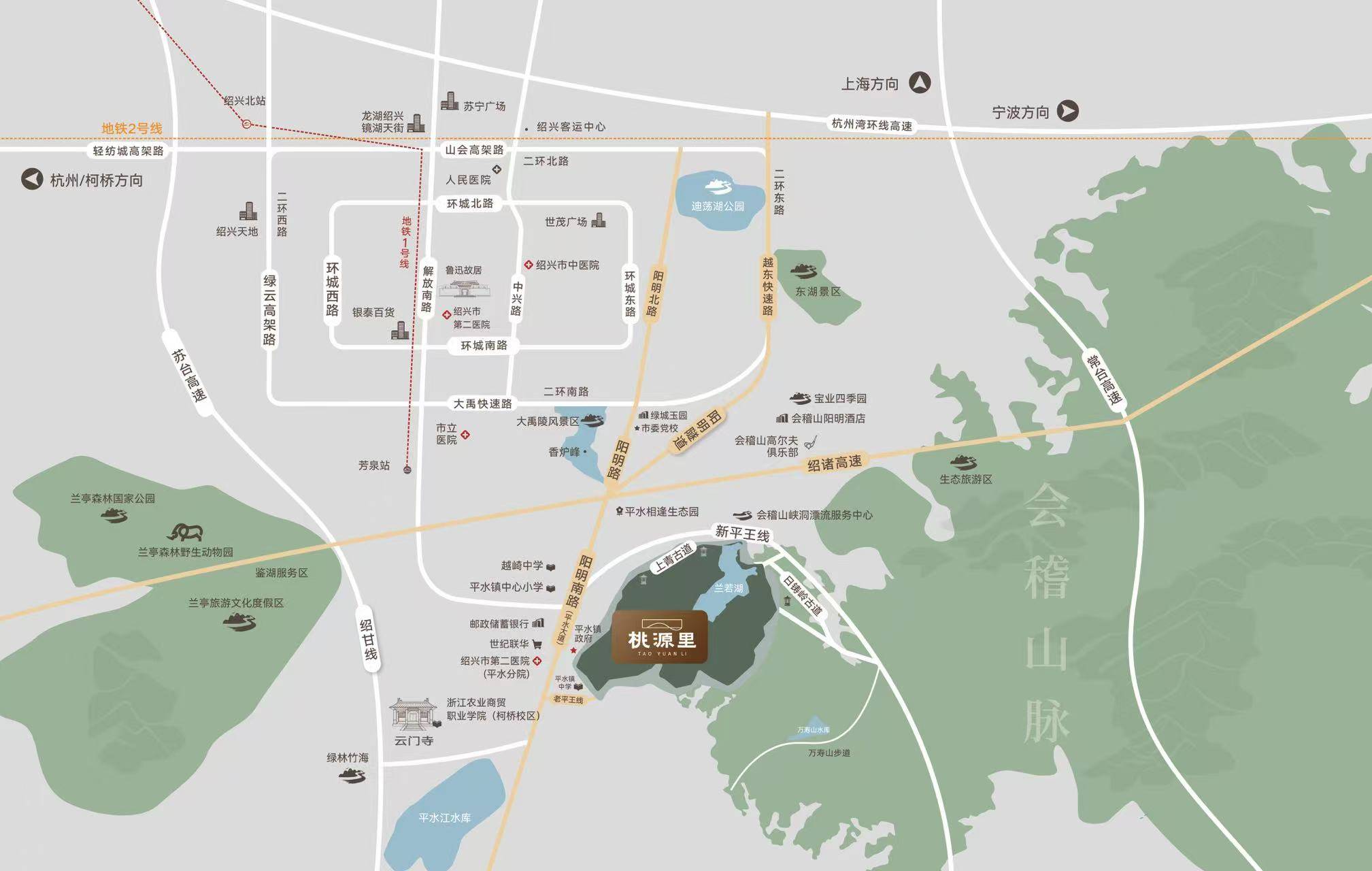 桃源里项目建面约127-269㎡湖山美学院墅,总建筑面积约16.6万平方米。位于绍兴南面会稽山板块,兰若湖畔,浙东唐诗之路北起点附近。紧邻阳明路,越东快速路高架(在建)瞬息抵达市中心。近邻银泰商圈、世茂商圈等繁华商圈。周边森林覆盖率高达78%,有约150亩的兰若湖;绍兴户外圣地新老平王线穿过;10公里内有阳明洞天、日铸岭古道、宛委山樱花林等多个知名景点;绍兴第二医院平水分院、绍兴市立医院等健康设施在侧。