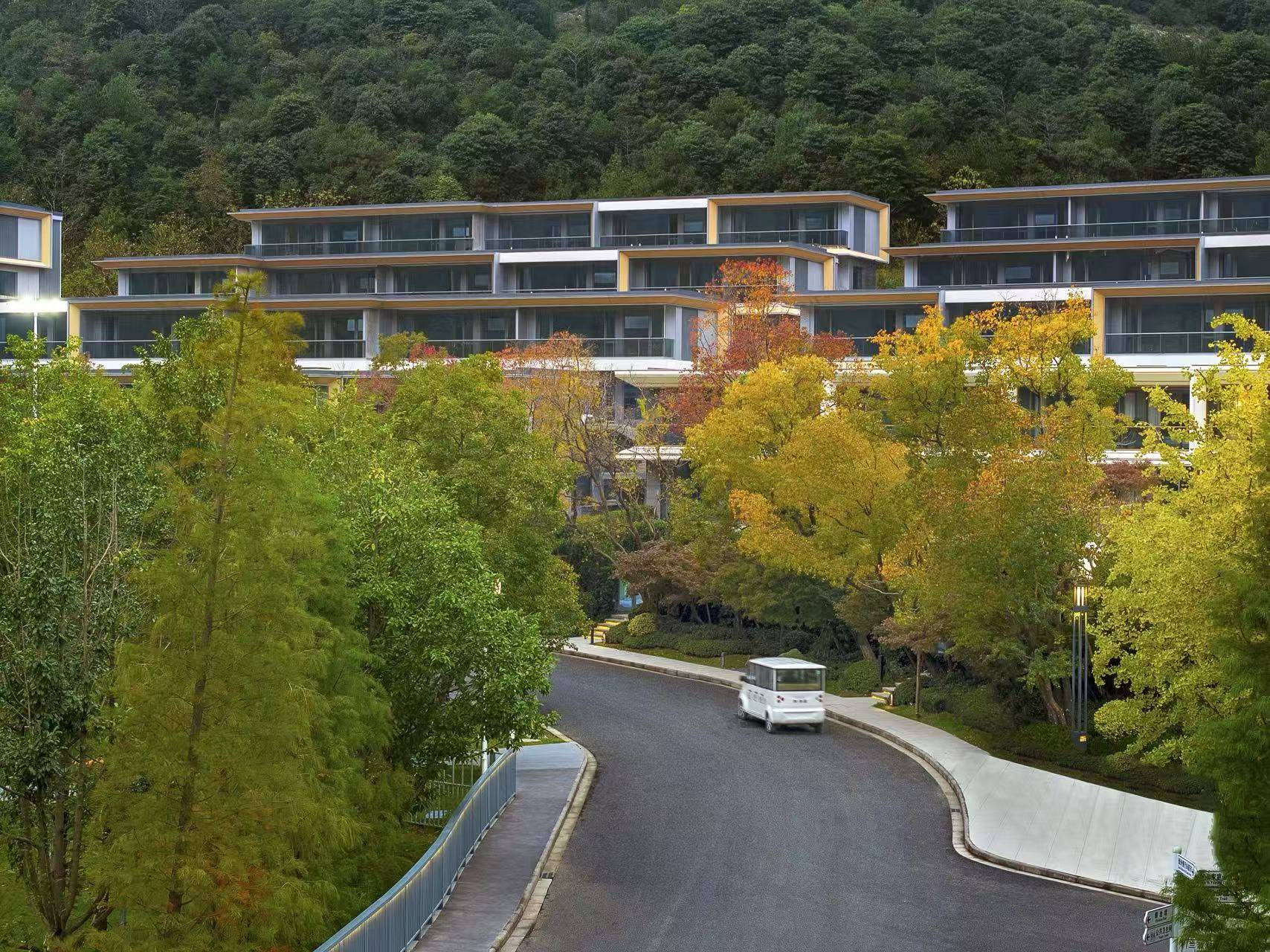 从入口花海开始,项目总占地面积约1500亩,建设用地仅约188亩。整个项目环湖而建,围绕着约150亩的天然水库兰若湖,剩余1000多亩全是山林和绿化,在这里可以听到风声、水声、鸟声、山林声,充分感知湖山生活的自然与美好。