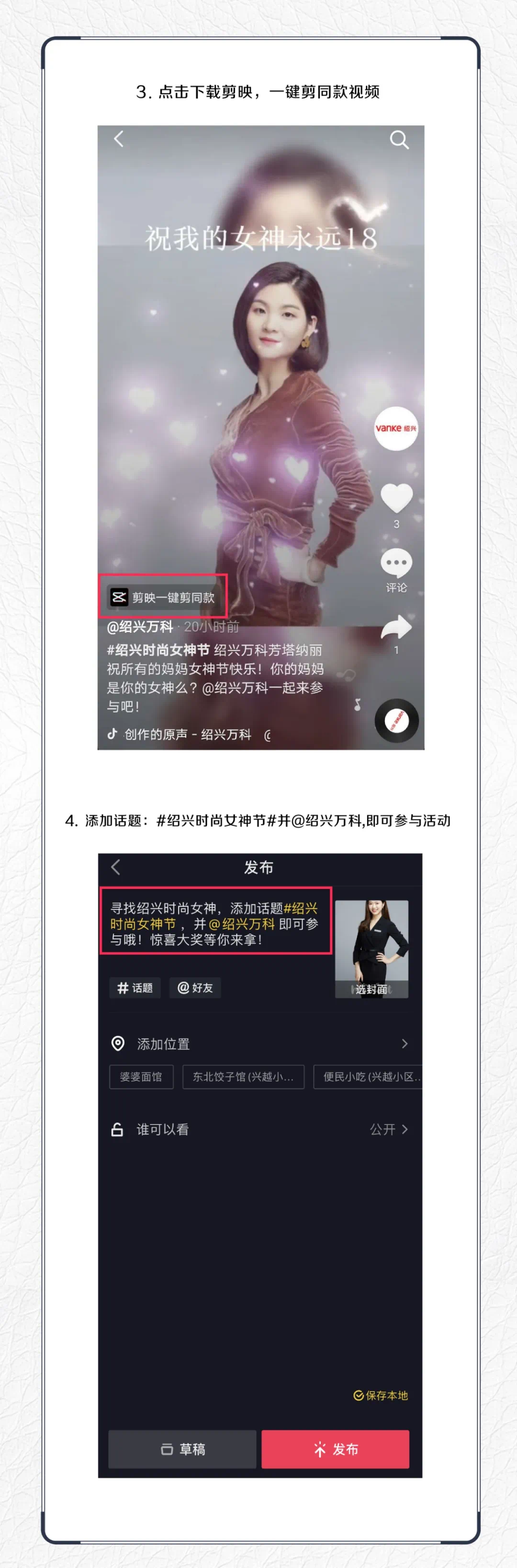 在抖音发布短视频,带上#绍兴时尚女神节#并@绍兴万科