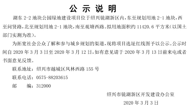 镜湖新区湖东2-2地块公园绿地建设项目选址许可规划公示